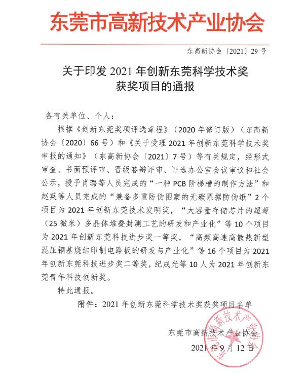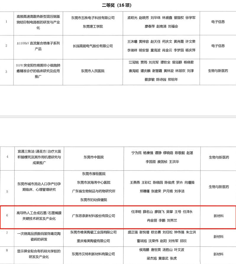 2021年9月,東莞高新技術(shù)產(chǎn)業(yè)協(xié)會(huì)發(fā)布“2021年創(chuàng)新東莞科學(xué)技術(shù)獎(jiǎng)獲獎(jiǎng)項(xiàng)目”的通報(bào),思泉新材的“高導(dǎo)熱人工合成石墨”和“石墨烯膜關(guān)鍵技術(shù)研發(fā)及產(chǎn)業(yè)化”項(xiàng)目成功上榜,榮獲二等獎(jiǎng)。